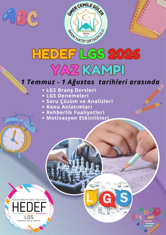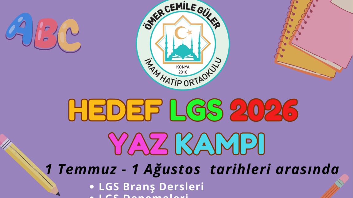 sınıftan 8. sınıfa geçen öğrencilerimiz için Hedef LGS 2026 için yaz kampı çalışma takvimimizi belirledik. Yaz kampımızda LGS dersleri uzman kadromuz tarafından verilecektir. Ayrıca Kazanım değerlendirme sınavları yapılacaktır.